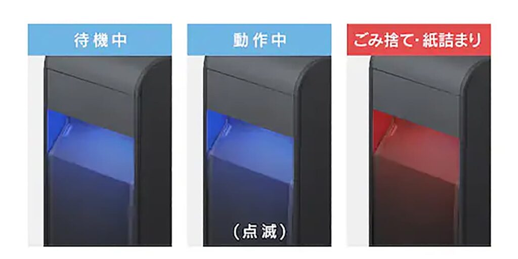 ダストボックスが一杯になると「ごみ捨てセンサー」が反応し、細断ランプが赤色に点滅して知らせてくれる。また、細断中や細断終了後には、自動でシュレッダーのカッター部分の細断くずを落としてくれる「オートクリーニング」機能も搭載しているから、細断くずで、運転がストップしたり、しっかりと細断してくれない、といったこともなく、しっかりと細断してくれる。