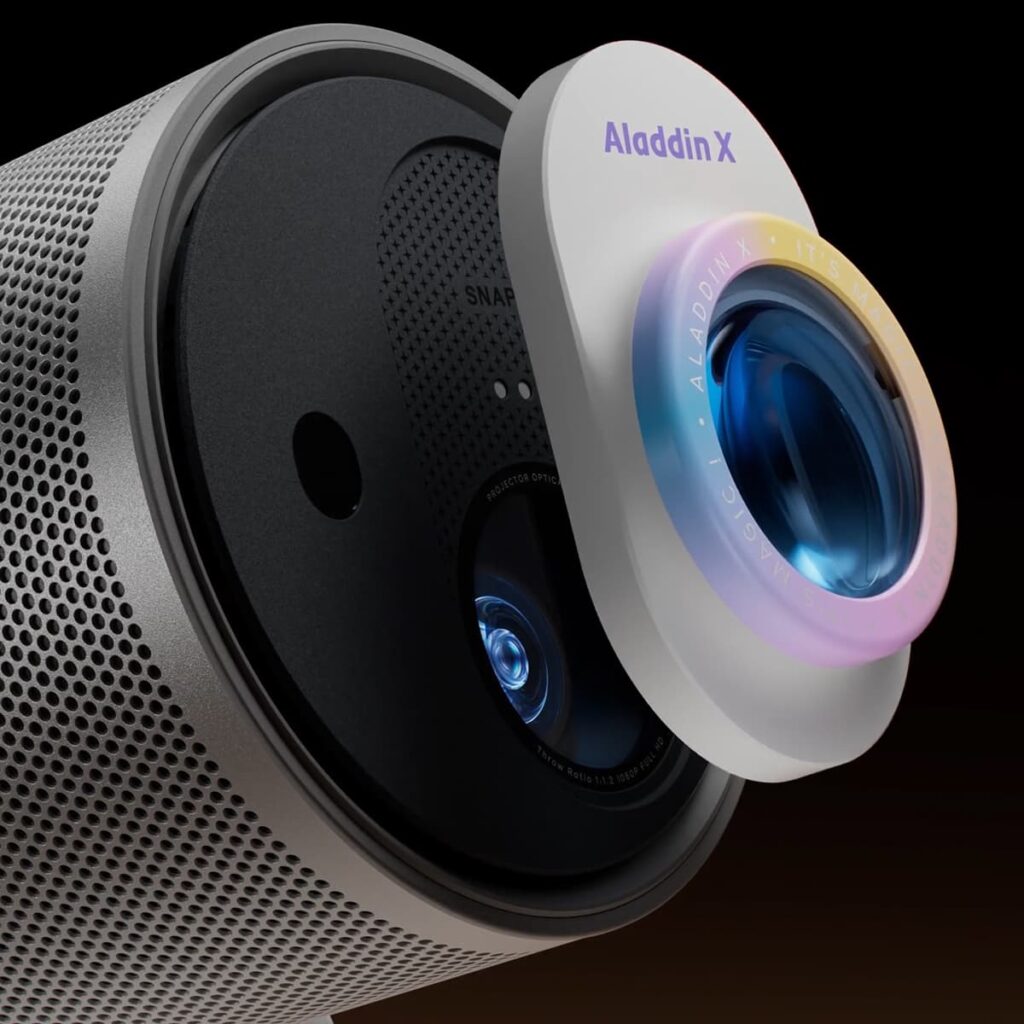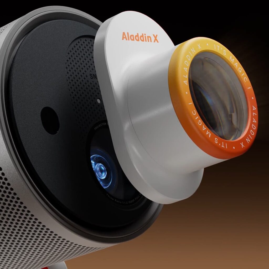 「Aladdin Poca」シリーズは、⼤画⾯(120インチサイズ)でのフルHD映像投影に加え、360°⾃在に回転するスタンドを内蔵。また、Aladdin OSを搭載しており、YouTubeやNetFlix、PrimeVideoなどの動画配信サービスや20種類以上のオリジナルアプリを楽しむことができる。内蔵するスピーカーにはHarman Kardon 製のスピーカーを搭載しており、より臨場感のあるサウンドを体感することができるとしている。さらに付属品として、本体に装着できるレンズ「AladdinLens」を2種類用意しており、装着することで、星空などの特別な映像を投影して、幻想的な雰囲気を楽しむことができる。なお、2つのレンズで合計100種類以上の厳選素材を収録しており、専⽤アプリ「ほしぞらさんぽ」からいつでも特別な映像体験を楽しめるのも「Aladdin Poca」シリーズならではとなっている。