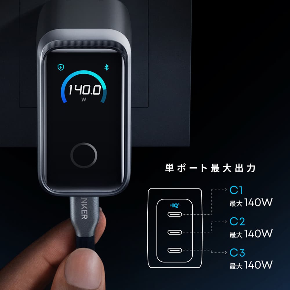 「Anker Prime Charger(160W、3 Ports)」は単ポートで最⼤140W、USB-C ポートを3つ使⽤時では合計最⼤160Wの出⼒と、ノートPC、スマホ、タブレット端末をこれ1台で同時に急速充電できる⾼出⼒が特徴のUSB 急速充電器だ。本製品