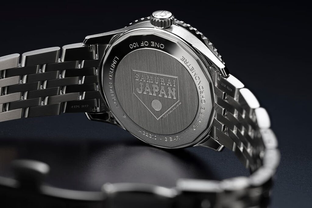 また裏蓋には「SAMURAI JAPAN」のエンブレムと、限定本数を示す"ONE OF 100"の刻印を施し、さらには、野球グローブを思わせる温かみのあるブラウンレザー調の特製ボックスにも、侍ジャパンのロゴをプリント。時計とともに、日本代表への敬意と誇りを感じることができるモデルとなっている。