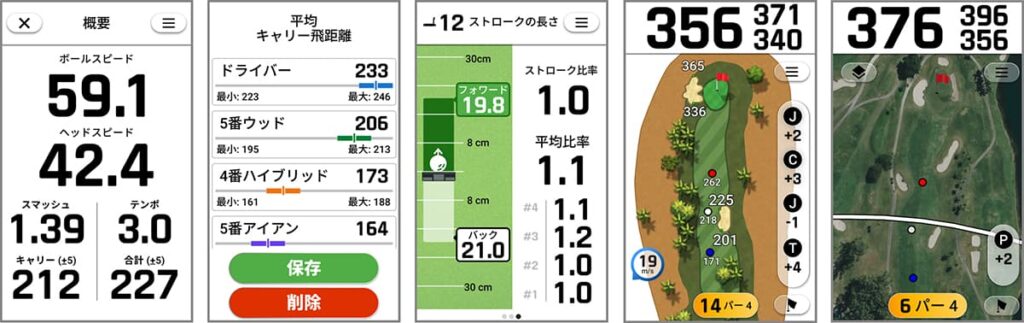 ゴルフ機能を一部抜粋して紹介すると、スイング計測機能、クラブマッピング、風速/風向き表示、PlaysLike距離(打つべき推奨距離)、バーチャルキャディ、Green Contour(グリーン傾斜情報)、デジタルスコアカード、自動クラブトラッキング、レンジリレー/レーザーレンジアークなどが挙げられる。