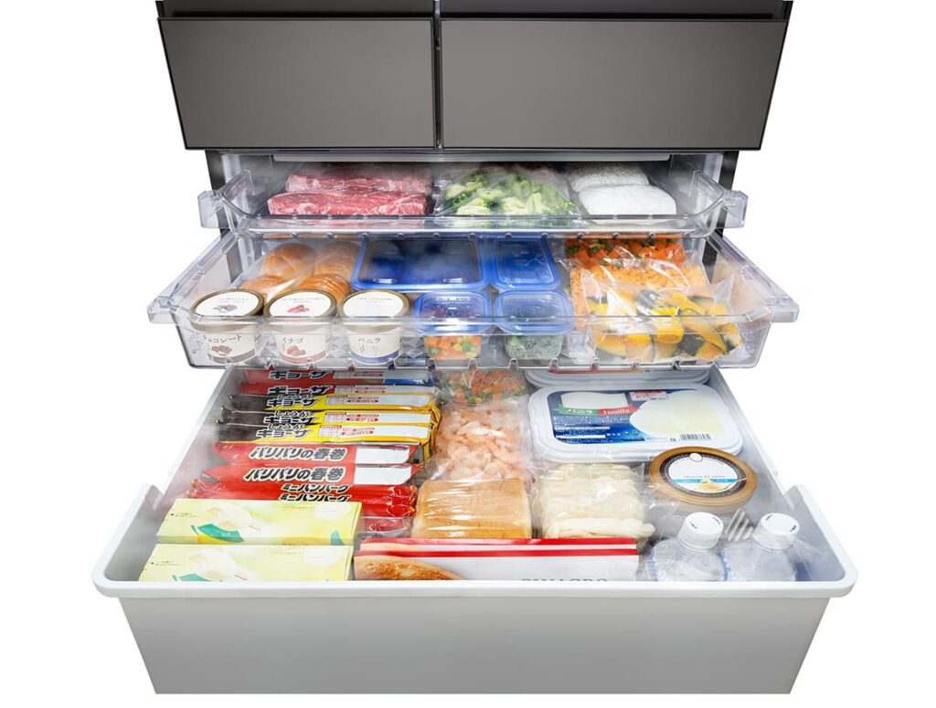 大容量冷凍室は、冷凍室下段に高さの異なる3 段ケースを備えるなど、食品の大きさに合わせて整理しやすくなっている