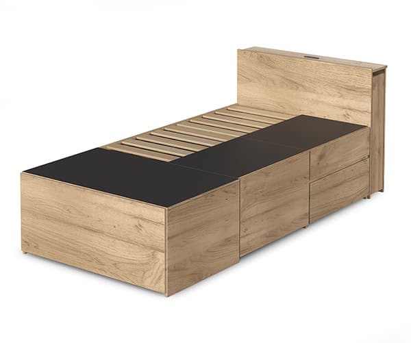 今回発売する全てのタイプに共通する、すのこ下のフリースペースは、ベッドの全長の約2/3のみを可動式にすることで、ベッドに敷いた三つ折りマットレスをすべて動かすことなく収納物を取り出すことができるようになっているため、手軽に出し入れができるようになっている。また、引き出しは上部に手をひっかける部分があるので、かがまずに簡単に引き出せるのもポイントと言える。