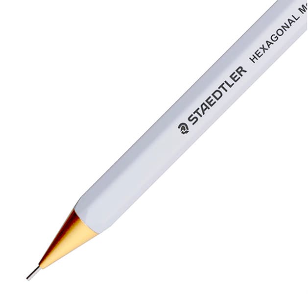 "ヘキサゴナル"シャープペンシルは、ペン軸に六角軸の金属ボディを採用しているのが特徴のモデル。適度な重みのある金属軸にマット塗装を施し、スムースなタッチで心地よいグリップ感を得ることができる人気のモデルだ。六角形の軸の角にわずかな丸みを持たせることで、長時間の筆記にも適した形状を実現。より持ちやすく、より書きやすく、より快適な筆記が行えるよう設計されている。また、口金に4mmのパイプを採用し筆記時の視界を広く保つとともに、ノック部分には硬度表示(H、HB、 Bなど)が一目でわかる表示窓を装備、製図用シャープペンシルとしての機能も備える。