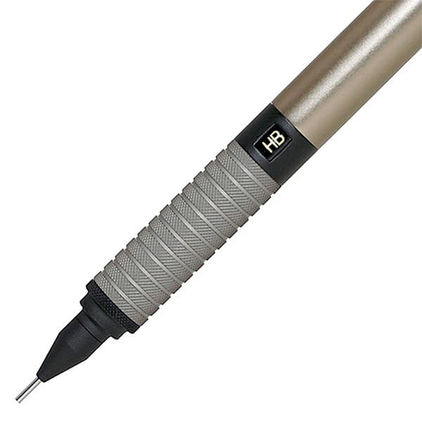 ペン先は、筆記時の視界を広く保つ4mmガイドパイプ付き口金を採用しており、書いている文字や線が見やすく、筆記や製図などで快適な使い心地が味わえる。本体はアルミボディの重厚感あるデザインとなっており、グリップ部分には細かい凹凸のローレット加工を施すなど、滑りにくく、優れた低重心設計とあわせて安定した筆記をサポートする。また、芯の硬度表示窓を装備しており、複数のペンを使い分けるプロユーザーにも支持されるなど、文房具好きの愛用者も多いシャープペンシルとなっている。