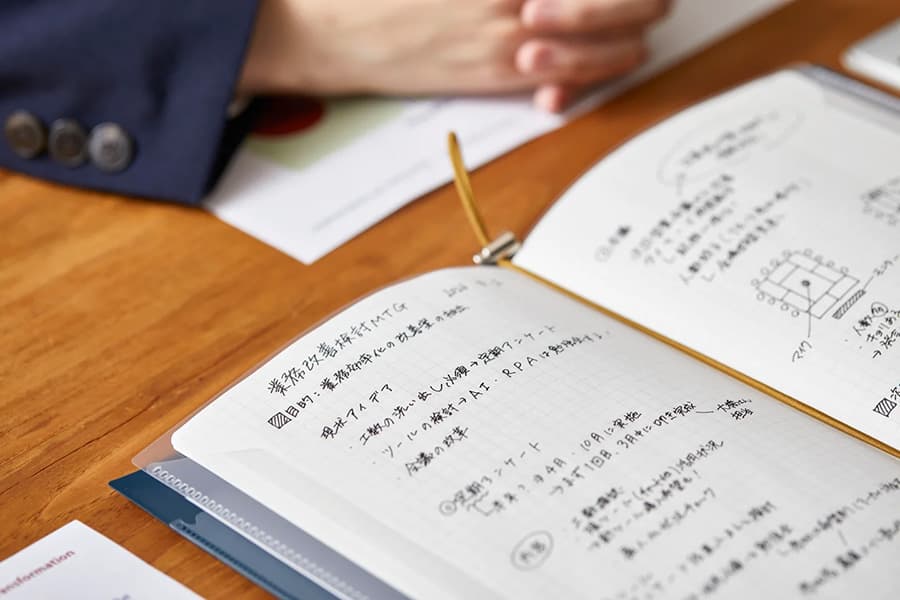 従来の書類とノートの管理では、配布された資料とそれに対応するメモを書き込んだノートを別々に保管することが多く、情報が分散して必要な情報が見つけにくくなるというケースもあることから、コピー用紙に印刷可能な豊富なフォーマットを用意し、目的にあわせてコピー用紙をノート化して活用することを提案。同社ではその提案を元に、情報を1冊に集約できるファイリングシステムを開発した。