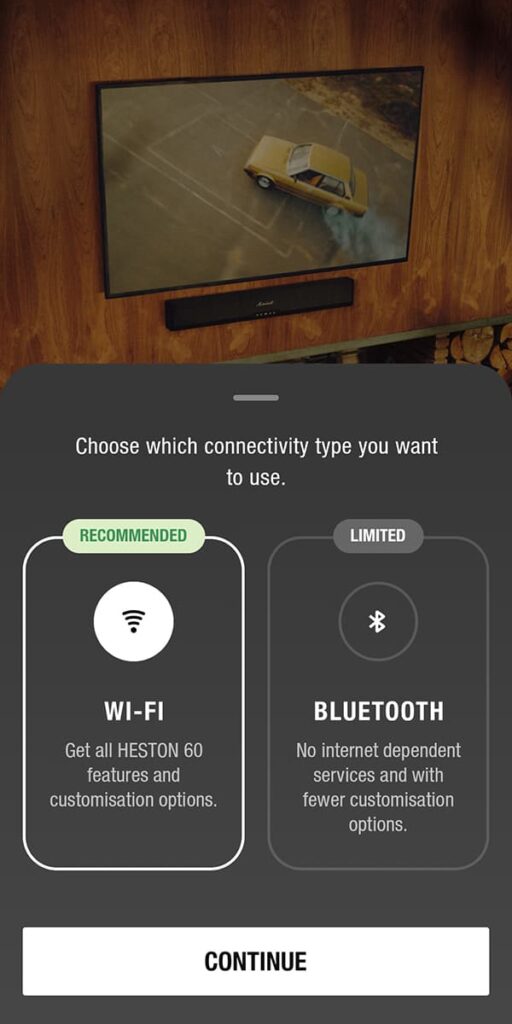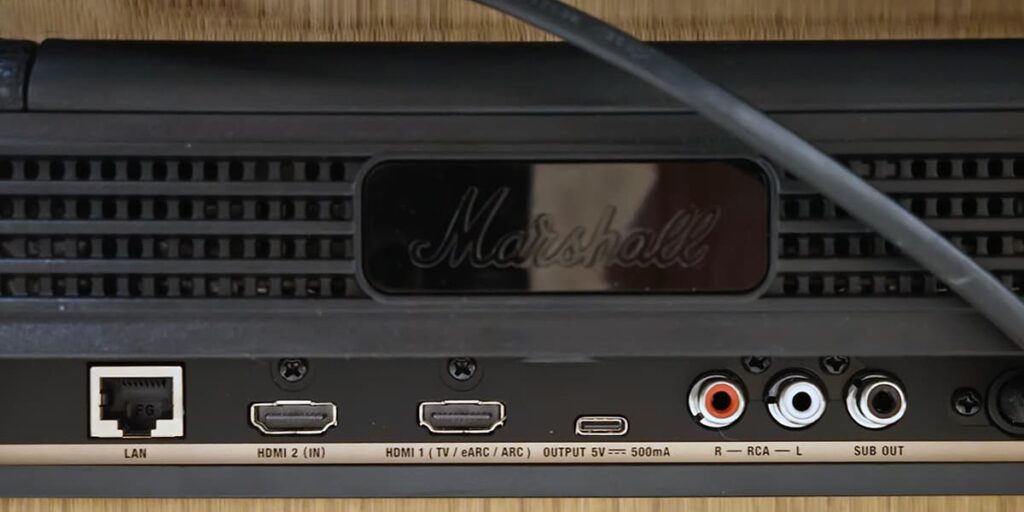 まずは、HDMIケーブルを使用して、「HESTON 120」とテレビをつなぐ。テレビ側は、EARCもしくは、ARCと書かれている出力側に接続し、「HESTON 120」のHDMI入力に差し込む。次に、「HESTON 120」をインターネットに接続するために、手持ちのスマートフォンにアプリ(Marshallアプリ)をダウンロードする。仮に、Wi-Fiのネットワークにアクセスができない場合は、イーサネットケーブルを使用して、有線として使用することも可能だ。