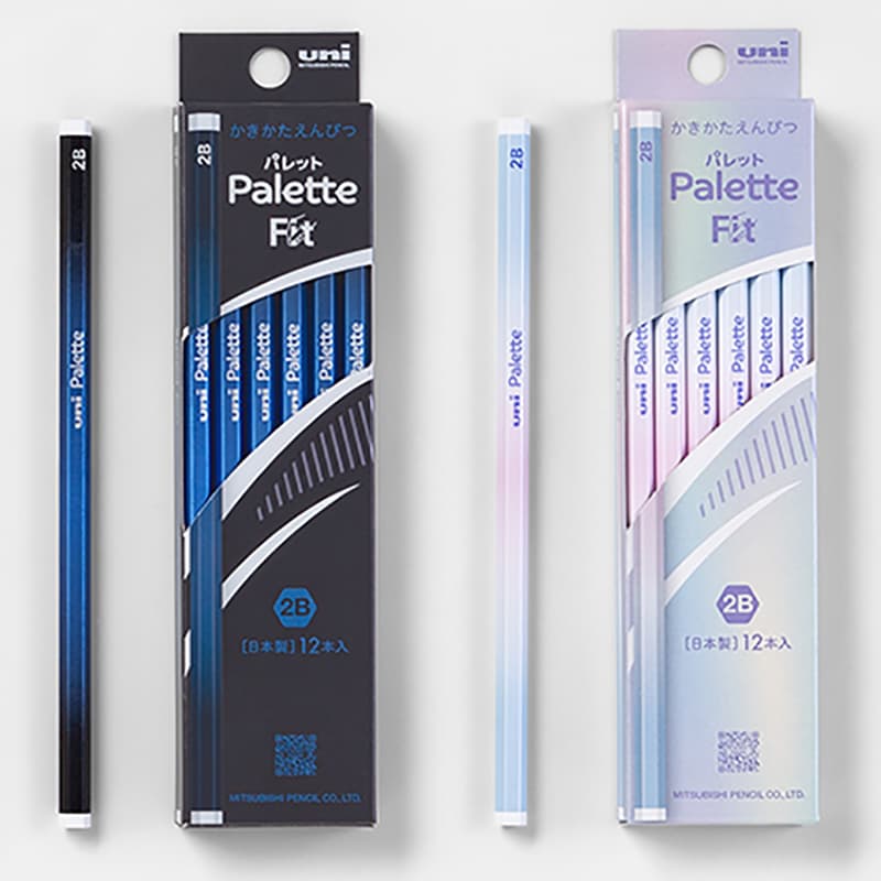 一方、「uni Palette Fit」は、スポーツ用品に着想を得た「uni Palette Fit」の2色は、グラデーションを利かせたスポーティーなデザイン及びカラーリングに仕上げられている。ノンスリップ加工を施し、滑りにくく握りやすいという機能性を持たせたことで「uni Palette」シリーズでは初の機能性鉛筆となっている。商品名からも、"フィット感""握りやすさ"をイメージしやすいものとなっている。