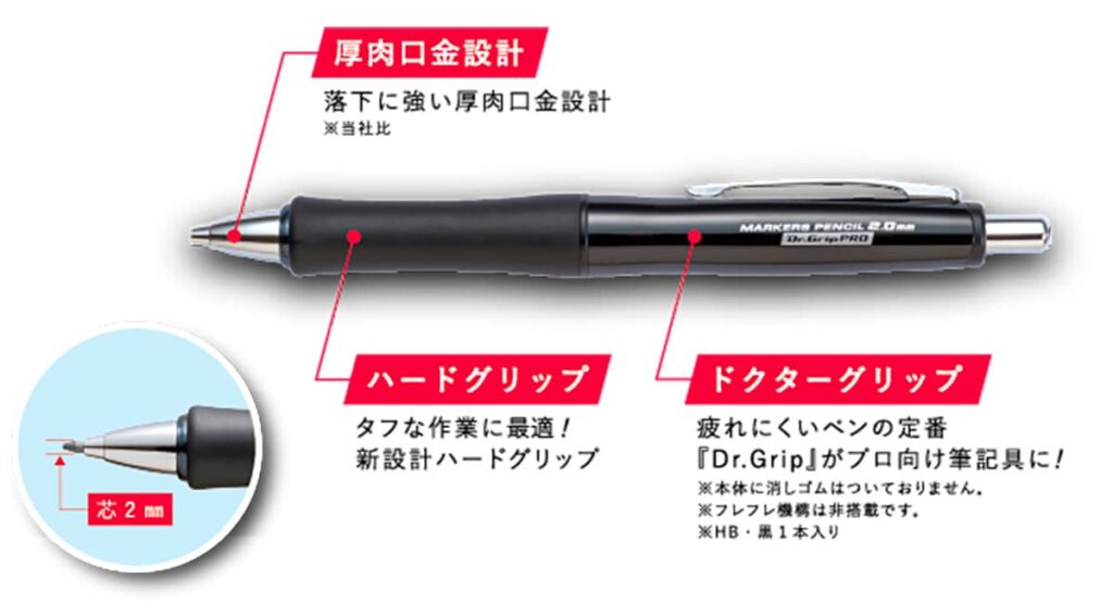 本商品は、筆記具メーカーとしてのノウハウを活かし、建築現場での過酷な使用にも耐えうる利便性と機能性を追求。木材やコンクリートといった建材への確実なマーキングを可能にするため、折れにくく濃く書ける2.0mm芯を採用するほか、現場での不意の落下に備え、想定される高さからの落下実験を繰り返し行っている。また、変形しにくい高強度の厚肉口金設計を採用に加え、人間工学に基づいて設計された"ドクターグリップ"の特徴である太軸のボディはそのままに、屋外の過酷な環境にも耐えるエラストマー製の"ハードグリップ"を採用。これにより滑りにくさが向上し、安定したマーキングをサポートしてくれる。