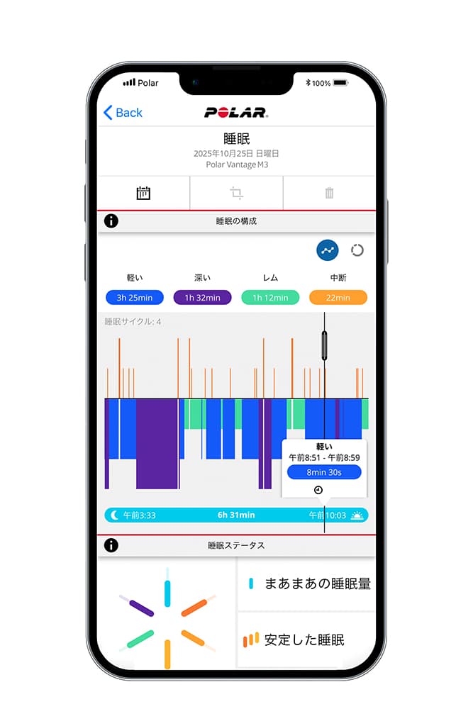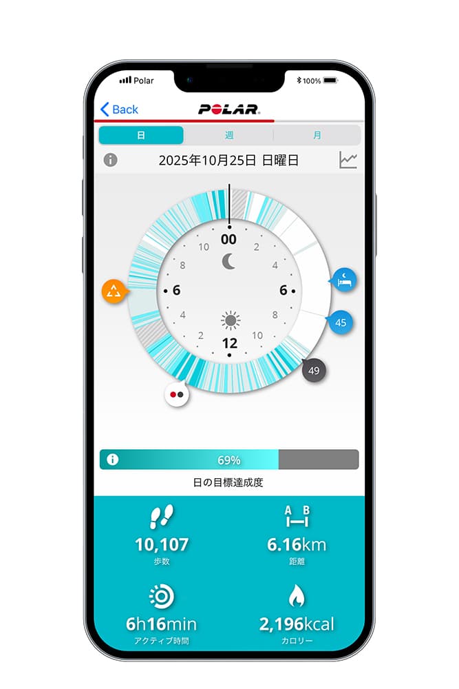 スクリーンレスということで、活動量、睡眠、運動内容などの確認は、スマートフォンを通してアプリでチェックすることでおこなえる。運動、消費カロリー、睡眠の記録には、ポラール独自の心拍計測技術が使用されており、40年以上にわたりスポーツ向け心拍計の開発に取り組んできた同社の技術によって、精度の高い正確なデータを獲得することが可能となっている。