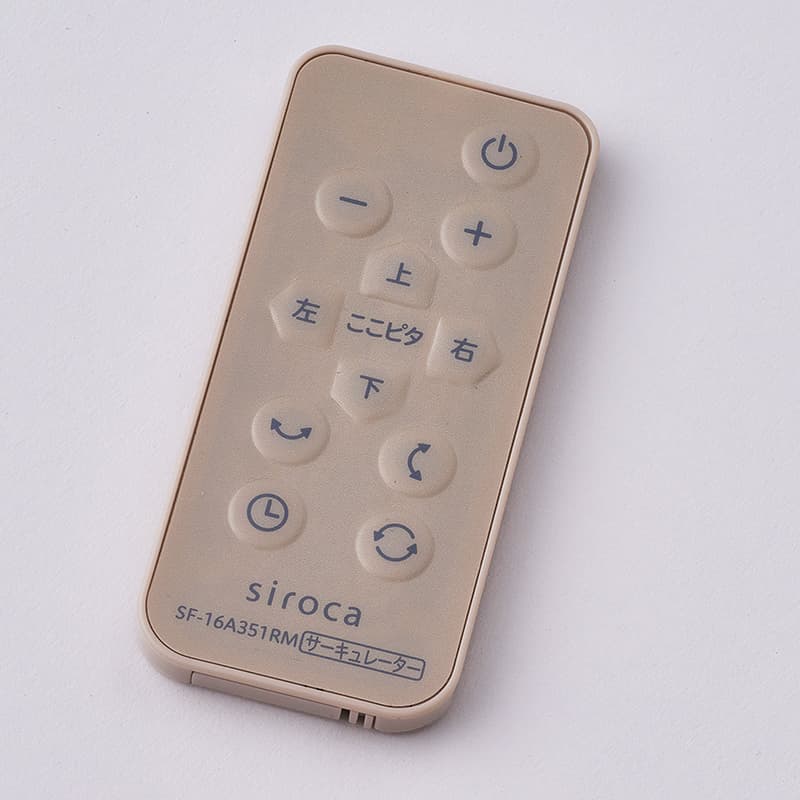 リモコンも付属しており、リモコンに設けられた「ここピタ」ボタンを長押ししながら、風を送りたい方向に向けて止めたい位置でボタンを離すことで、首の向きを細かく調節することが可能。正面から左右合計330°(左右それぞれ165°)、上90°の範囲で調節できるため、欲しいところにピンポイントに風をおくることができる。