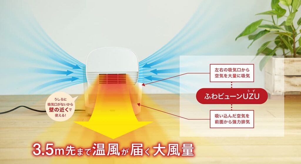 シロカ独自の「ふわビューン UZU」によって、大風量の温風を送ることができるばかりでなく、室内干しの洗濯物に向ければ、乾きにくい冬場の室内干しの洗濯物でも、手軽に素早く乾かすことができるとしている。温風時(風量3段階)であれば約3.5m先まで、暖かい風を送ることができるほか、送風時(風量7段階)には、約20m先まで風を届けることができるなど、コンパクトながら、その実力は折り紙付きだ。これだけの風量を実現しながら、静音性にも優れており、温風で弱運転の場合には約23dB、送風の風量を1にして運転した場合の音は、約16dBなど、就寝時でも気にならない稼働音となっている。
