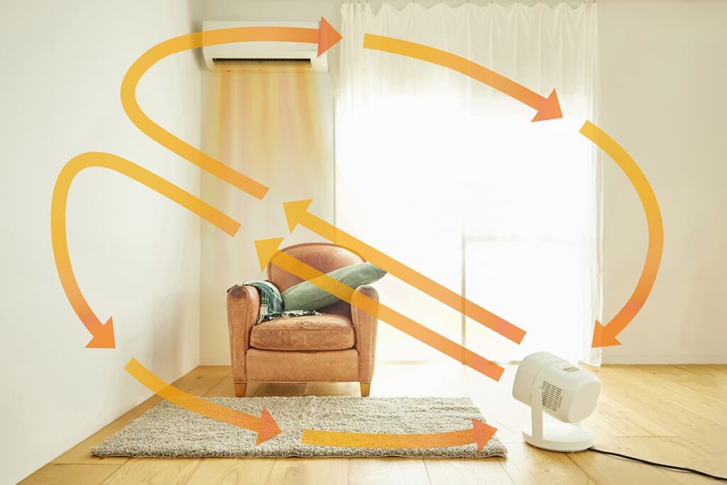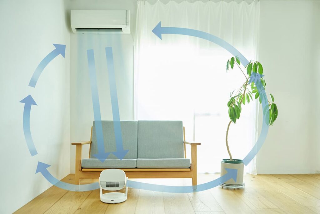 エアコンと併せて使えば、より効率的にエアコンの風を循環させらるため、例えば、冬場のエアコン使用時に併用すれば、部屋の上に溜まってしまっている暖かい空気を、部屋全体にまんべんなく送ることができる。加えて、ヒーター機能を使えば、暖かい風で、循環させることができるため、一般的なサーキューレーターで空気を循環させるよりも、肌寒さを感じることなく、循環させることができるのが特徴的だ。