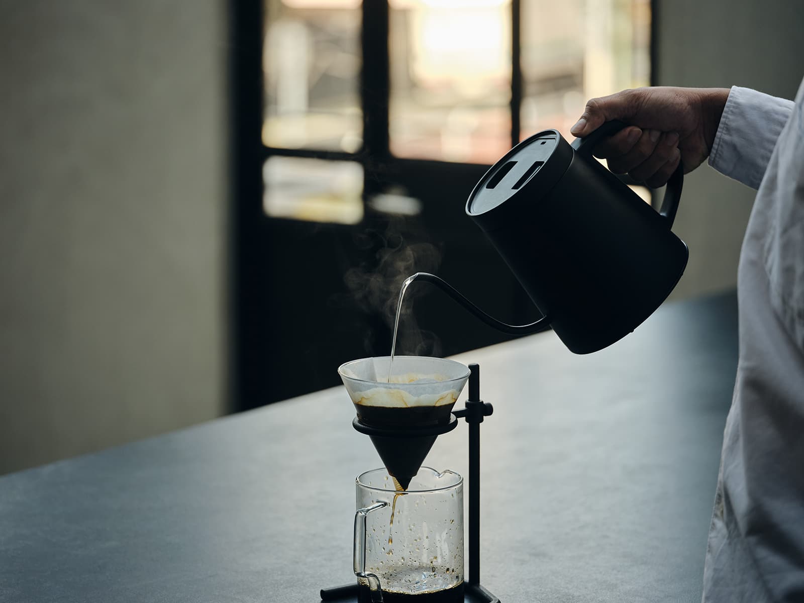 天面と注ぎ口の高さを揃えたこだわりの細口ノズルも特徴的で、狙ったところに細くまっすぐお湯を注ぐことができるように設計されている。これにより、コーヒーのハンドドリップの際には、お湯を細くゆっくりと注ぐことが可能になることから雑味が出にくくなり、結果的にコーヒーの味をしっかりと抽出することができる。