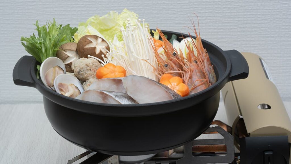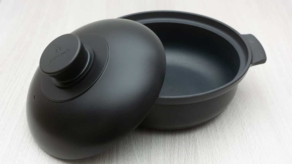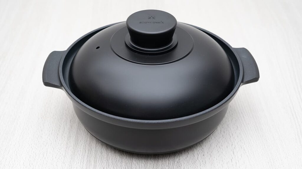 スノーピークでアルミニウム合金製の鍋「野宴鍋30」を少し小ぶりにしたことで、4人で使いやすいサイズ感になっている。また、外装と蓋裏にブラックカラーのセラミックコートを施し、鍋内面にフッ素加工を施しています。土鍋のフォルムでアウトドアでの使用にも適し、ジャンルを問わず鍋料理を楽しむことができる。