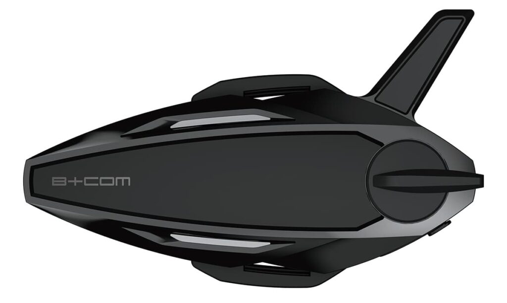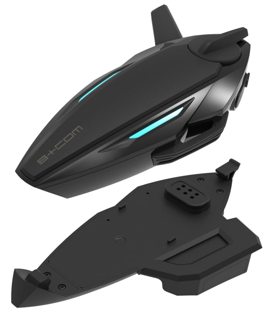 着脱方法とデザインも考慮されており、本体ユニットとヘルメットの取付は、つけやすく、はずしやすい、マグネットクレードル式を採用。特許取得済の軽快な装着感と確実にロックができる独自機構を採り入れている。今回、初めて台座であるクレードル側にスピーカーとマイクケーブルを配線したことで、本体ユニットの着脱ごとにケーブル類を接続する手間がなくなり、利便性が大幅に向上している点も見逃せないポイントだ。デザイン面は、B+COMのアイデンティティを踏襲し、1面1ボタンというシンプルなデザインにすることで、グローブをしたままでも操作しやすくしており、音量調整時など、直感的操作を可能にしている。さらに現代らしい美しさへと進化させるため、LED点灯・点滅は「点」から「線状」の動きへ進化した「モーション型LED」、本体とクレードルの一体化したデザインに加え、カナード風のボタンデザインを採用したことも付け加えておきたい。