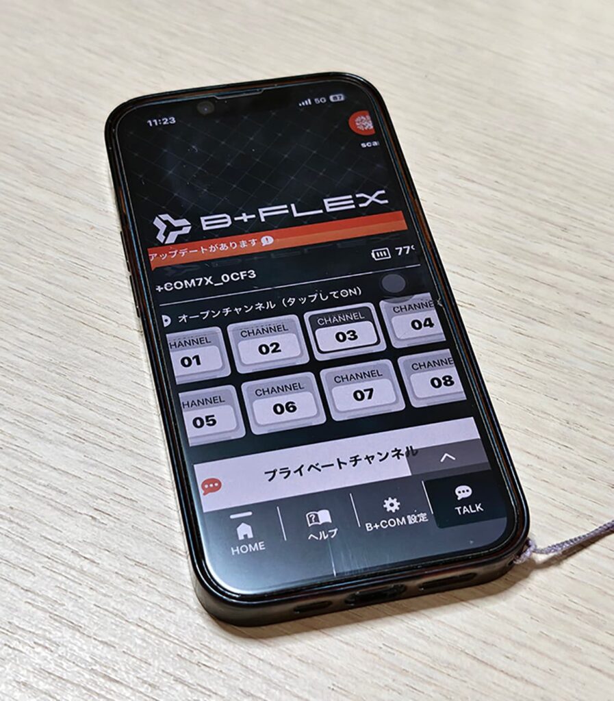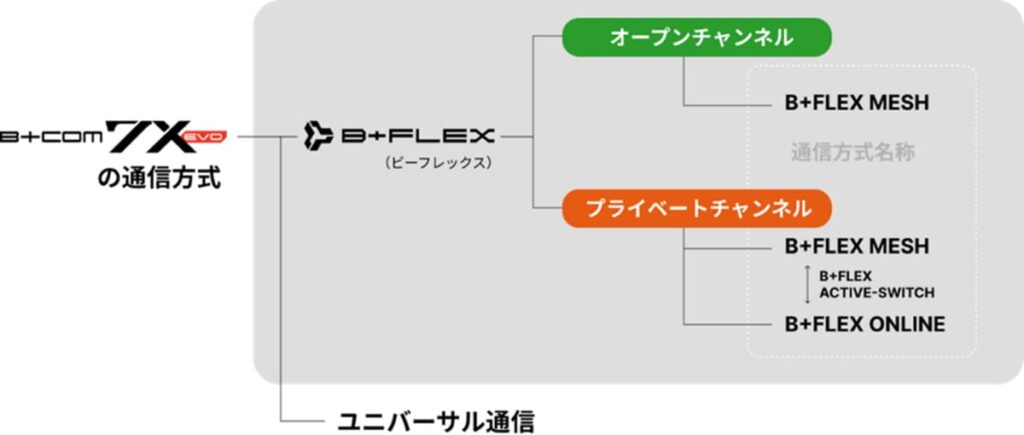 メッシュ通信は、「B+FLEX オープンチャンネル」と「B+FLEX プライベートチャンネル」の2種類となっており、オープンチャンネルは人数無制限で、最短1アクションで通話を始められるうえ、面倒なペアリング操作不要で通話が可能。8つのチャンネルを用意することで混線のリスクを軽減する。プライベートチャンネルはグループでの通話に使われ、最大20人までつながることができるうえ、再接続もスムーズに行える。アプリで簡単にグループ設定ができ、通信圏外になると自動でオンラインに切替わる。