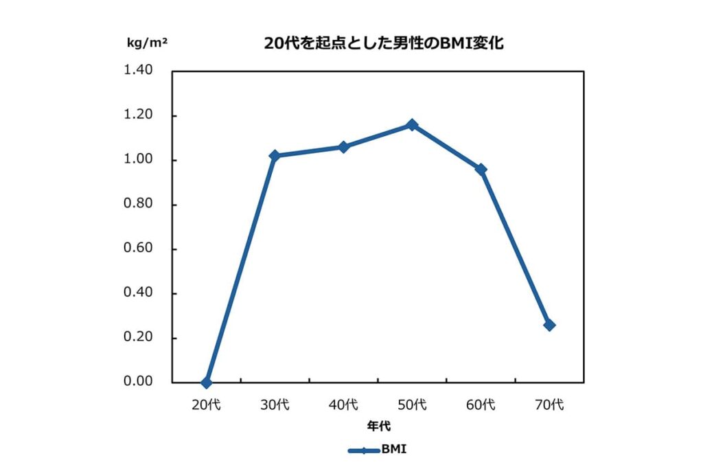 多くの男性ビジネスパーソンが、加齢とともに、スーツのウエストがきつくなる悩みに直面する。はるやま商事のスーツ購買データを見ると、10代・20代ではスリムな「Y体」「A体」が主流だが、30代を境にウエストにゆとりのある「AB体」への移行が顕著になっている。この悩みとスーツ型の変化を裏付けるように、タニタが持つデータでも、20代から30代にかけてBMIが急上昇する傾向が出ている。