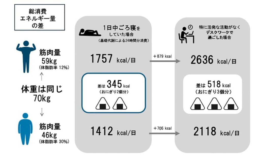 加齢に伴う体形変化の中で「今の体形を維持したい」「理想の体形に近づきたい」という場合、カギとなるのは「脚の筋肉量」。筋肉量が多い体は基礎代謝量が高く、運動をしなくても多くのエネルギーを消費することができる。脚(下肢)の筋肉は全身の筋肉の約6割から7割を占めており、加齢により脚の筋肉が減ることで、総消費エネルギー量が大きく低下する。例えば、同じ体重70kgでも、筋肉量が59kgと46kgの人では、1日の基礎代謝量には「約345kcal(おにぎり約2個分)」もの差が生じることになる。つまり、脚の筋肉維持を怠ることが、結果として脂肪の蓄積しやすい体質を招き、体形変化を加速させる要因となっているのだ。