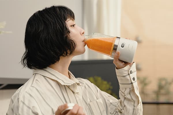 本体の高さは、約21cm、バッグにも入れやすいサイズ感で、持ち運びに便利なホルダーも付属する。USB充電式(タイプC)のコードレスモデルなので、いつでもどこでも作りたてを楽しむことができる。また、高性能DCモーターの採用により、1分間に約17000回転もの高回転を可能にしている。プロテインなどもサッと溶けるほか。家庭用製氷器の氷(2~3粒)や半解凍した冷凍フルーツも液体と一緒に撹拌することができる。