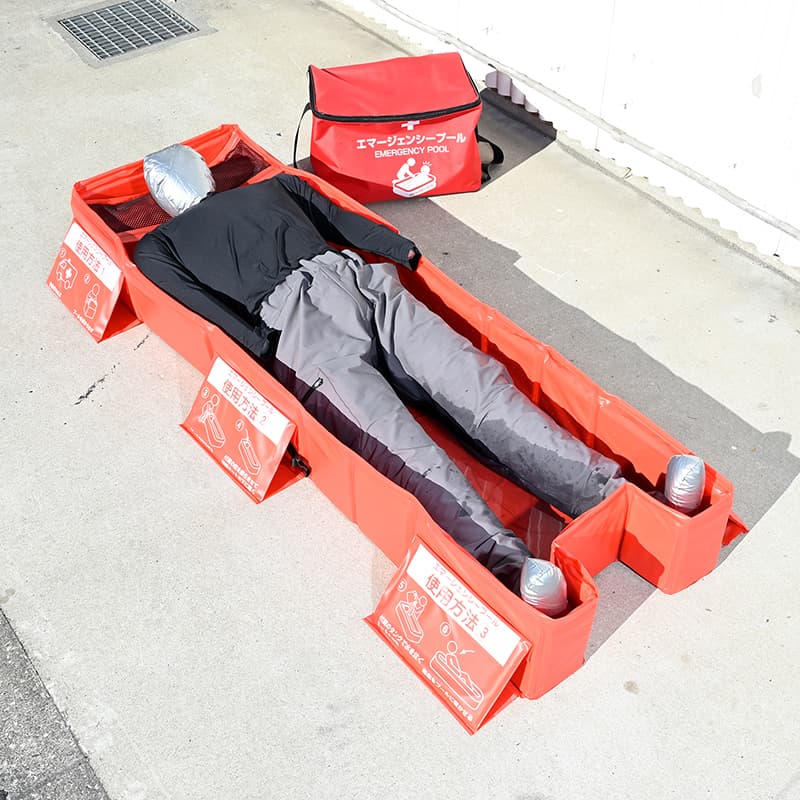 スポットクーラーと併用することで、暑熱環境下でも一時的に身体を休められる"涼しい空間"を、さまざまな現場に手軽に設置できるのが特徴。使用後はコンパクトに収納して、付属のキャリーバッグで持ち運びも可能なことから、作業現場やイベント会場などさまざまな場所で熱中症対策が行なえる。加えて、万が一、熱中症が疑われる場合に備えて、身体を冷却できる「エマージェンシープール」も発売する。「熱中対策シェルター」と併用することで応急対応環境の整備にも役立たせることができる。
